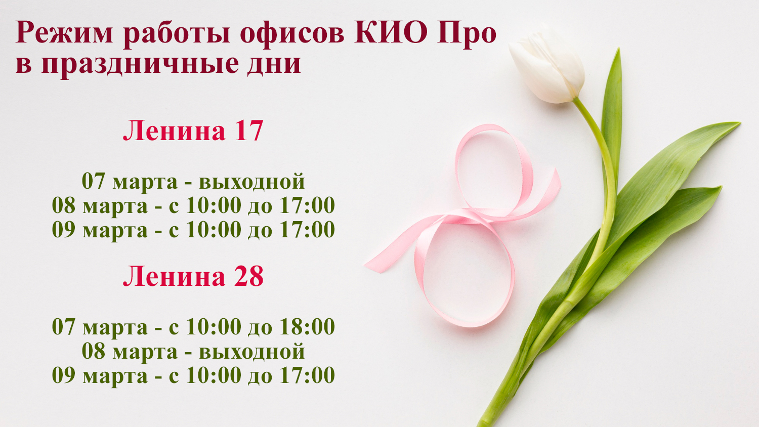 Режим работы офисов КИО Про с 07.03.2026 по 09.03.2026