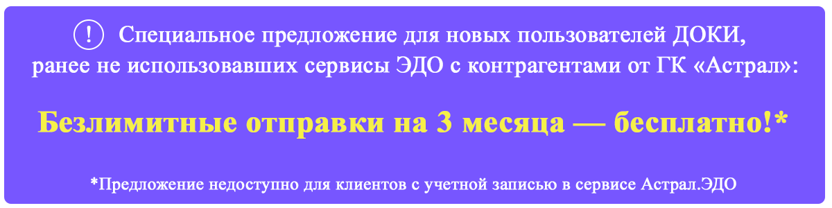 Доки - сервис электронного документооборота от ГК "Астрал". Сервис предназначен для обмена юридически значимыми документами с контрагентами через оператора электронного документооборота (ЭДО).